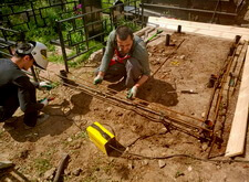 Приступаем к возведению фундамента. Монтируем металлические сваи, ввариваем каркас из арматуры.