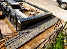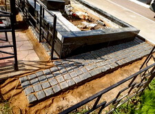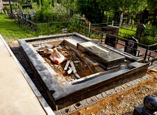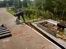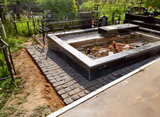 Приступаем к работе с цветниками. Один уже был в наличии, поэтому делаем второй, идентичный. По проекту цветники должны смотреться одинаково даже несмотря на то, что памятники будут разные. В это же время укладываем гранитную брусчатку уже на территорию места захоронения.